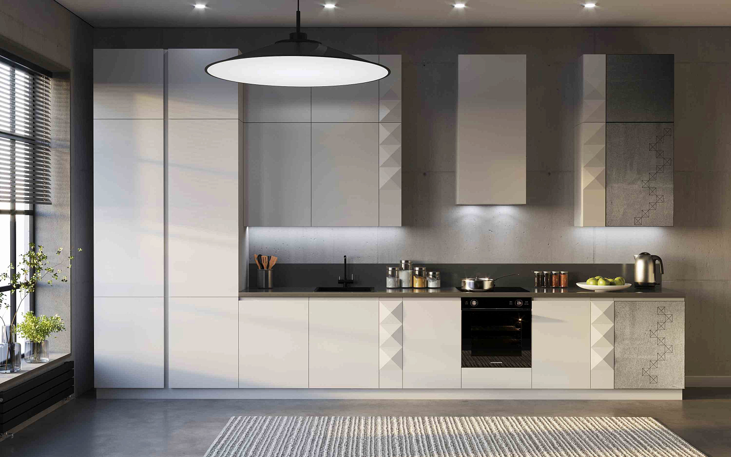 Эта модель в стиле хай-тек подойдёт любителям лофт-интерьеров и насыщенных текстур бетона. Строгий рисунок узоров смягчается чистым полотном панелей. Отделка под бетон хорошо сочетается с цветовыми ак...центами и контрастными текстурами.