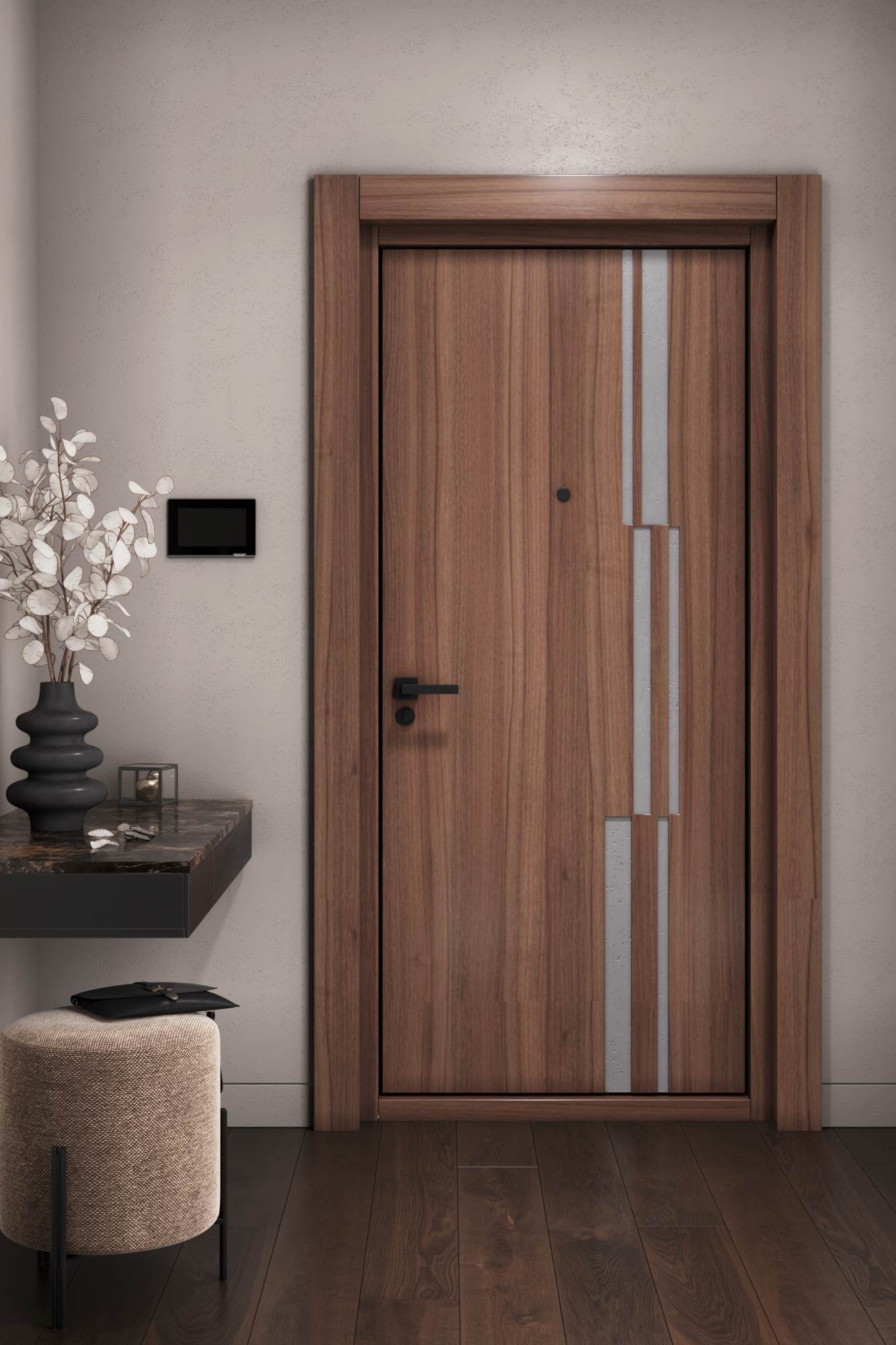 Эти параллельные бетонные вставки, конечно, не пересекаются. Но и не сливаются в единые полосы за счёт разной ширины и положения. Фактурный рисунок деревянного полотна создаёт идеальный фон, составлен...ный из вертикальных линий.